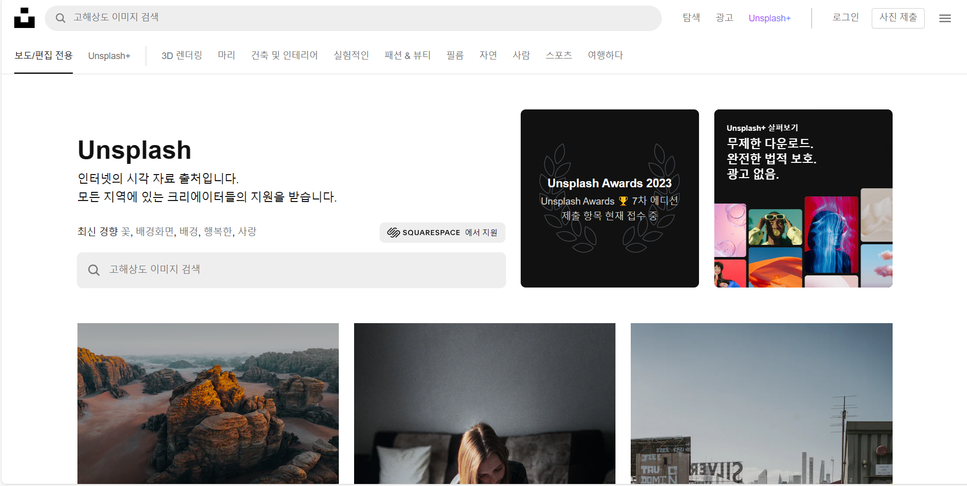 | 언스플래쉬 | 전 세계 사진작가 작품 공유 | 한글 지원 | 불필요 | 블로그·웹디자인 |