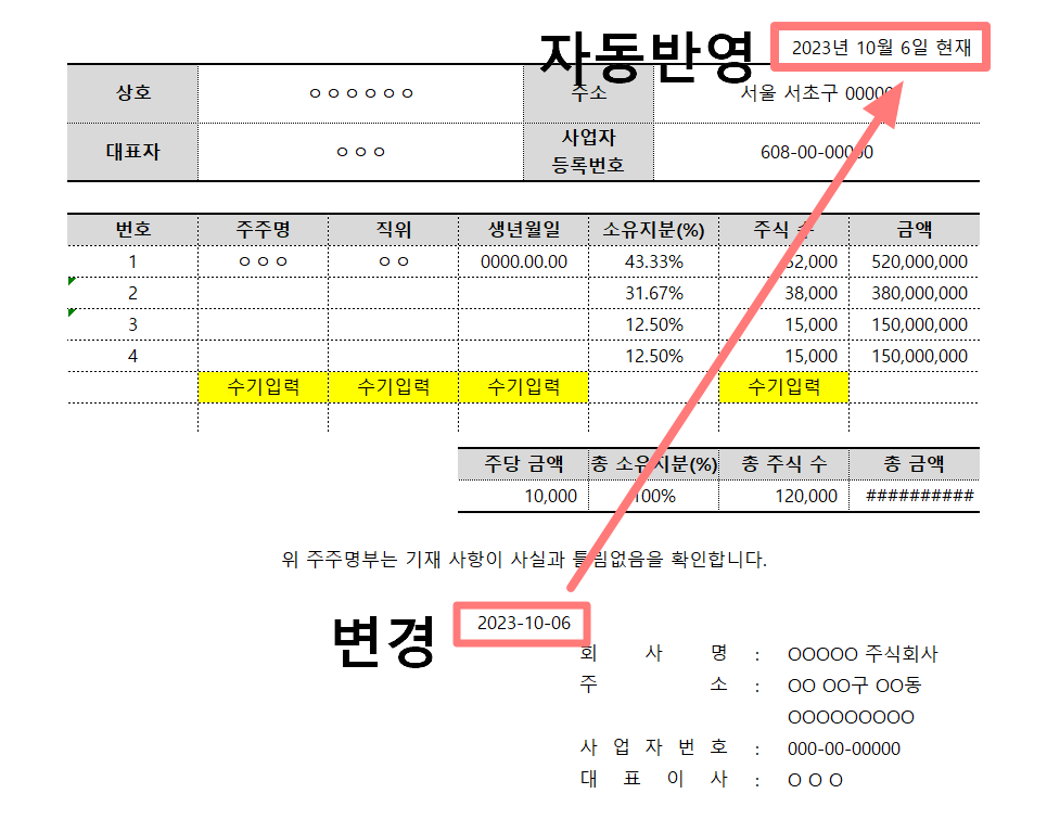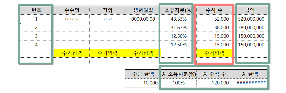 - 주식수 입력 시 [번호], [소유지분(%)], [금액], 아래 [합계] 등이 자동 계산됩니다.
