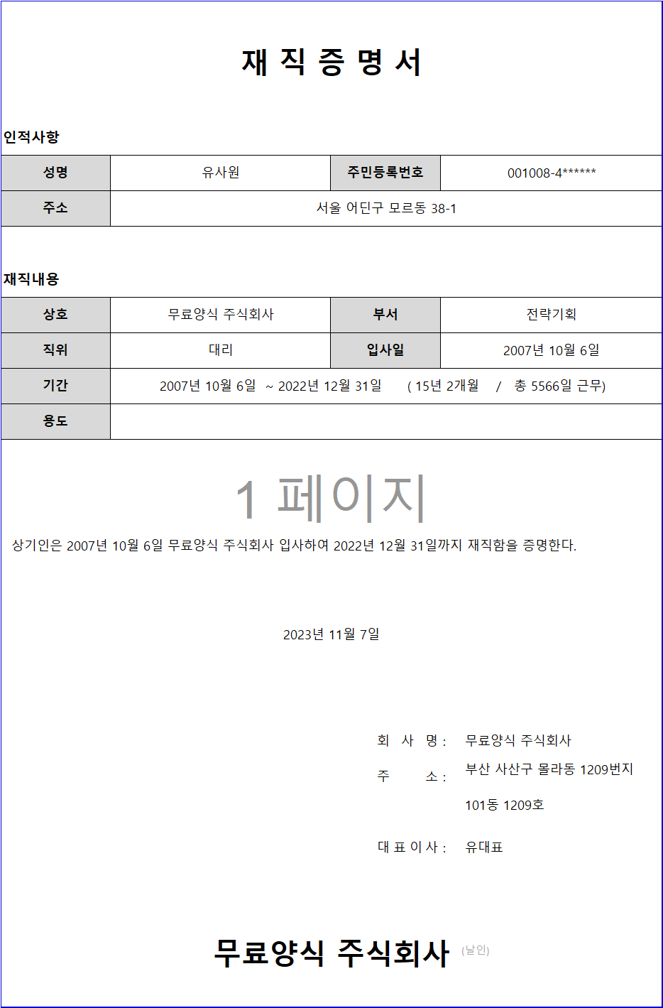 1. [재직증명서]