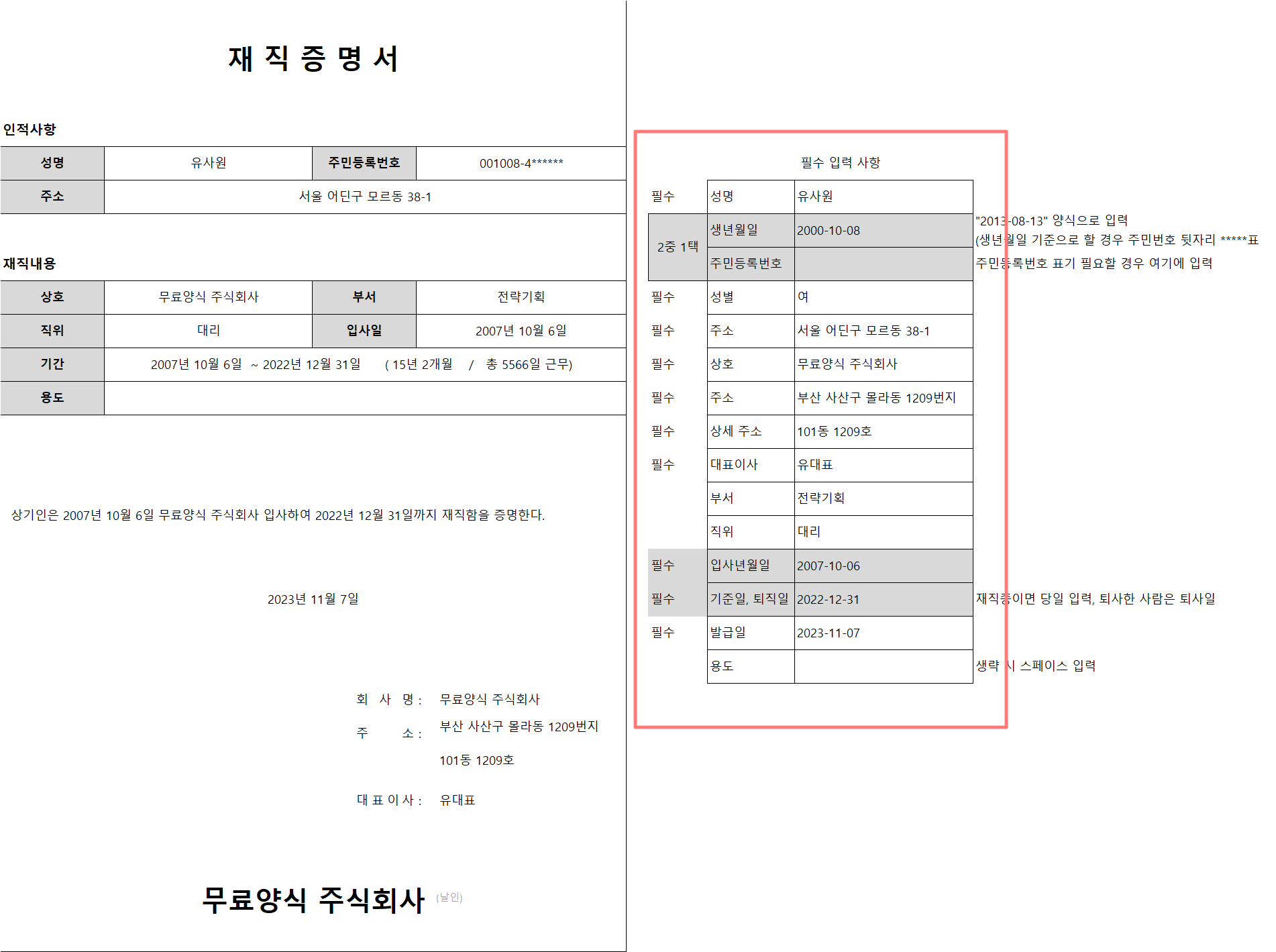 4. [엑셀 재직증명서 참고사항]