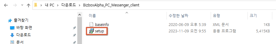 - 압축 파일을 풀고, BizBox Setup.exe 파일을 실행합니다.