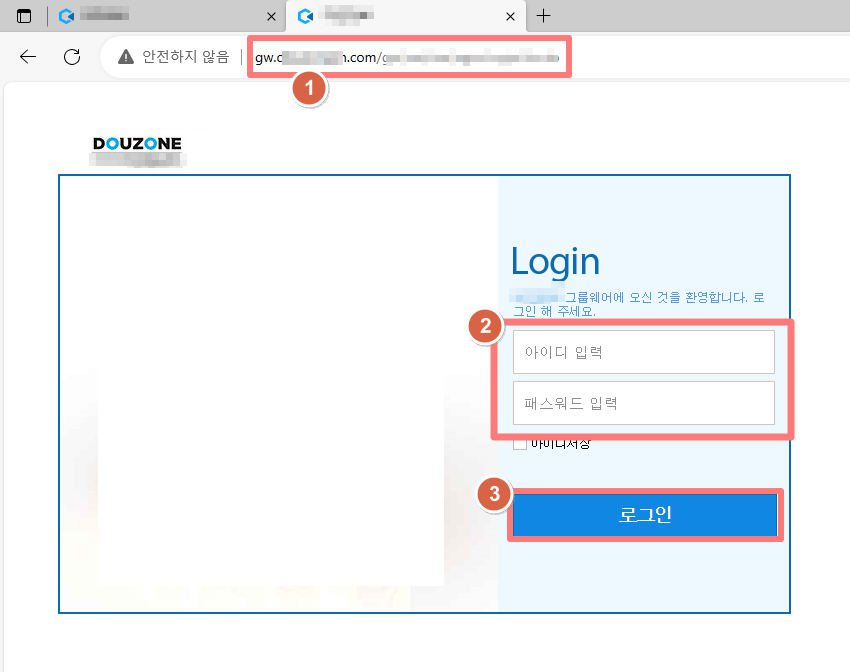 - 보통 gw.회사명.com 형식의 전용 주소로 접속합니다.