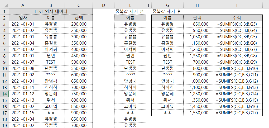 일자 + 이름 + 금액을 하나의 데이터로 인식하고 중복된 것을 확인한다.