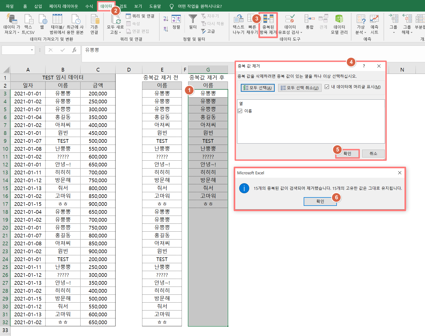 2) [중복된 항목 제거] 클릭