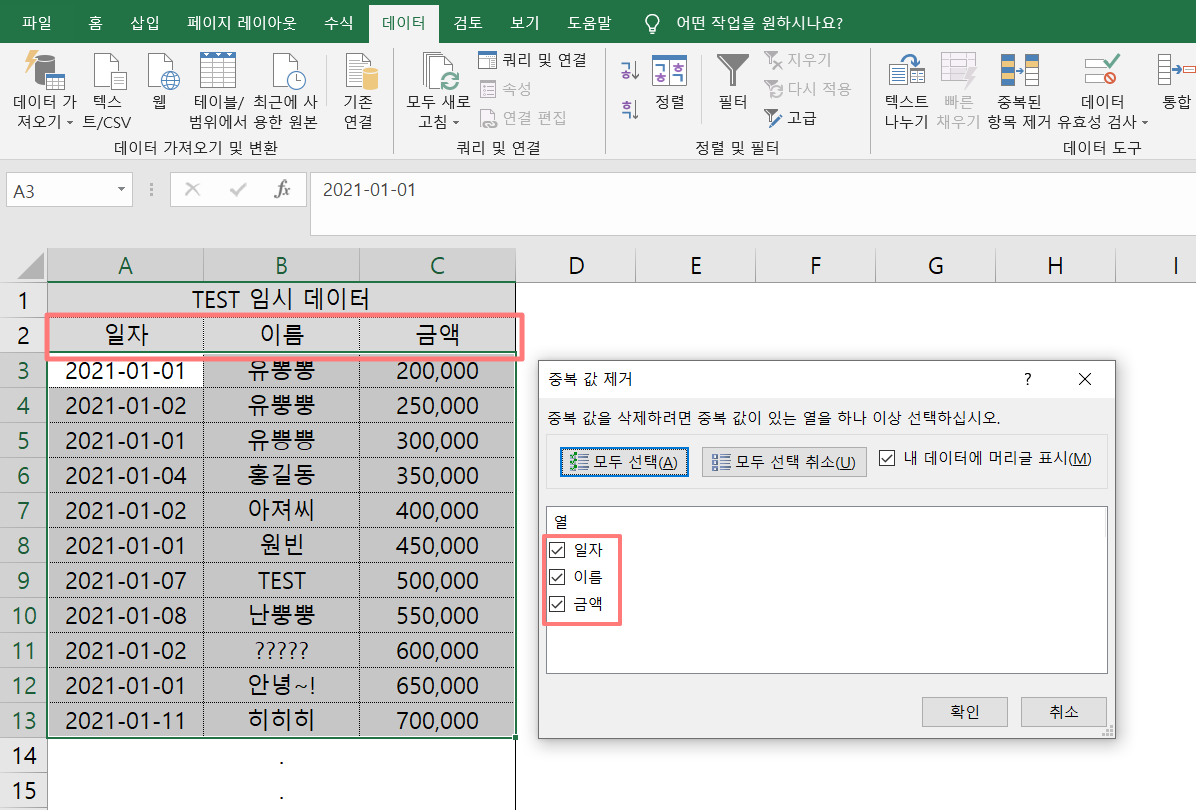 데이터표를 선택한 후 클릭하면 아래와 같은 [중복 값 제거] 창이 발생한다.