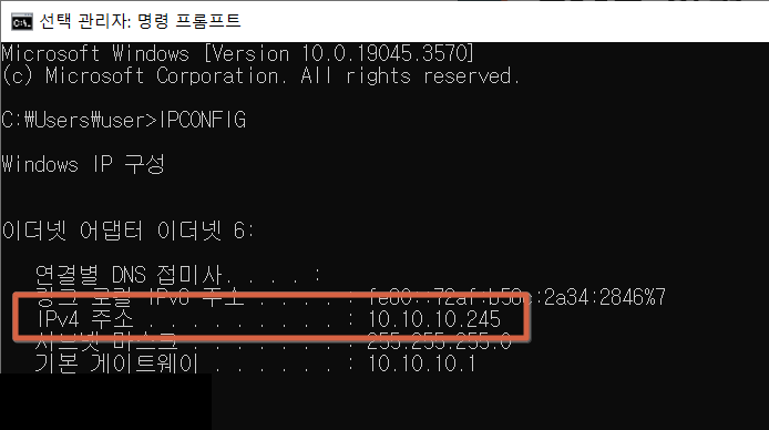 3) CMD 명령어 IPCONFIG (고정 IP로 변경 안 했을 경우)